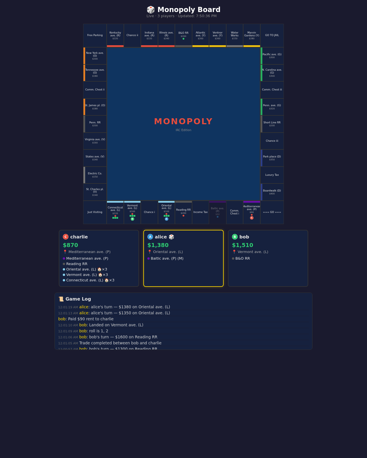 Screenshots generated via Playwright showing key game states: - 01_midgame_properties_owned: Properties with colored owner indicators - 02_houses_built: Houses/hotels rendered on properties - 03_after_trade: Board state after a property trade - 04_baltic_mortgaged: Mortgaged property display - 05_bob_bankrupt: Bankrupt player with skull/opacity/strikethrough - 06_game_over: Game over with winner confetti Also includes earlier QA screenshots: - single_player_joined: Lobby with one player registered - player_bankrupt_game_over: Bankrupt endgame state Tools: screenshot_states.py (synthetic states) and screenshot_integration.py (integration test scenarios)