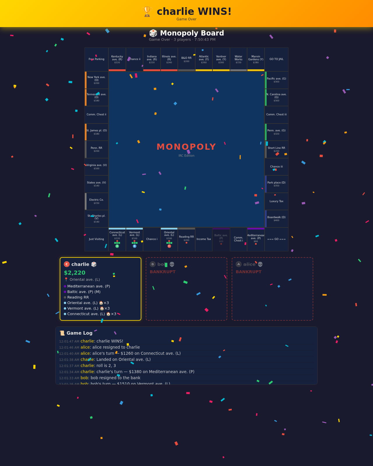 Screenshots generated via Playwright showing key game states: - 01_midgame_properties_owned: Properties with colored owner indicators - 02_houses_built: Houses/hotels rendered on properties - 03_after_trade: Board state after a property trade - 04_baltic_mortgaged: Mortgaged property display - 05_bob_bankrupt: Bankrupt player with skull/opacity/strikethrough - 06_game_over: Game over with winner confetti Also includes earlier QA screenshots: - single_player_joined: Lobby with one player registered - player_bankrupt_game_over: Bankrupt endgame state Tools: screenshot_states.py (synthetic states) and screenshot_integration.py (integration test scenarios)