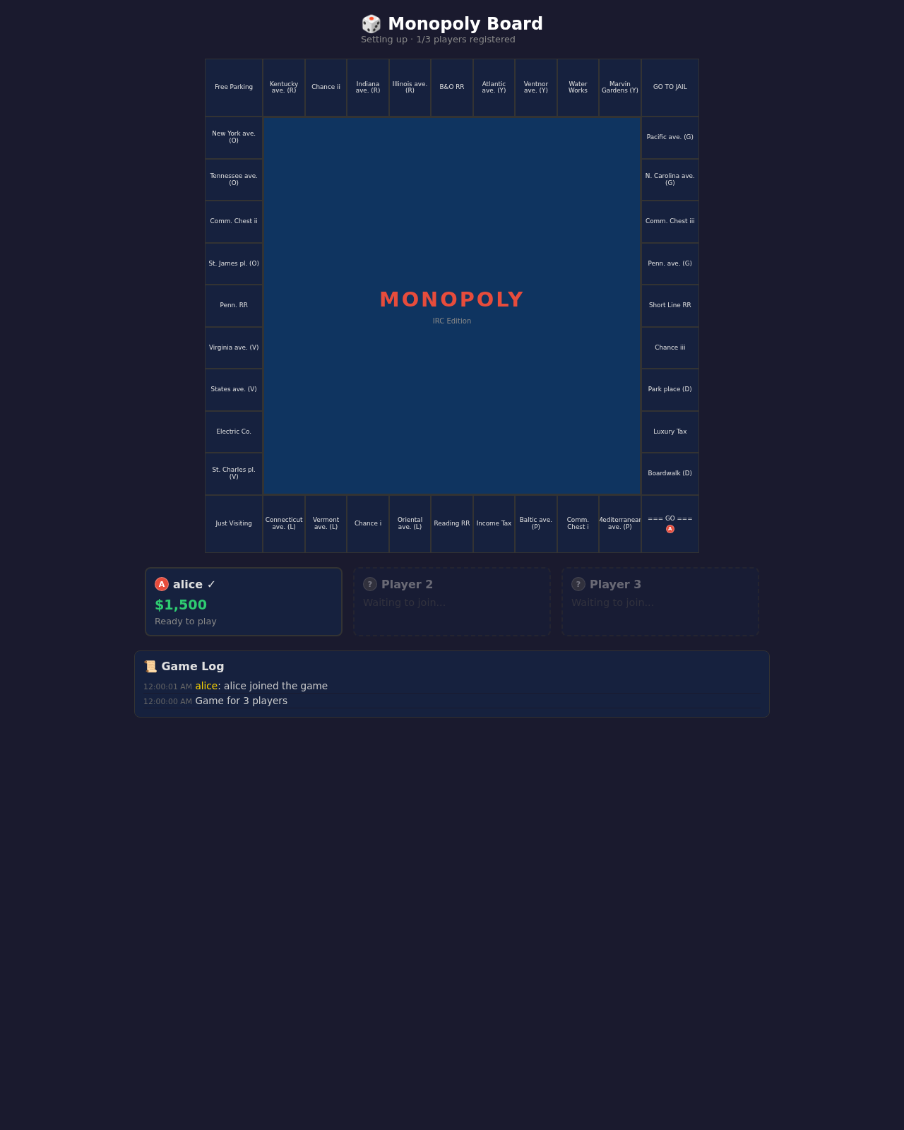 Screenshots generated via Playwright showing key game states: - 01_midgame_properties_owned: Properties with colored owner indicators - 02_houses_built: Houses/hotels rendered on properties - 03_after_trade: Board state after a property trade - 04_baltic_mortgaged: Mortgaged property display - 05_bob_bankrupt: Bankrupt player with skull/opacity/strikethrough - 06_game_over: Game over with winner confetti Also includes earlier QA screenshots: - single_player_joined: Lobby with one player registered - player_bankrupt_game_over: Bankrupt endgame state Tools: screenshot_states.py (synthetic states) and screenshot_integration.py (integration test scenarios)